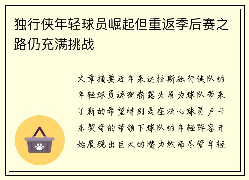 文章摘要:近年来,达拉斯独行侠队的年轻球...
